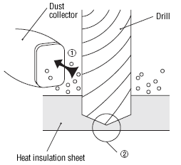 When machining, be sure to suck up dust into a dust collector so that it may not scatter. Safety measures for usual works in dust, such as masks and goggles, are required as the insulation sheets contain glass fiber which may affect the skin such as itching. When dust attaches to the machine, its accuracy may diminish.