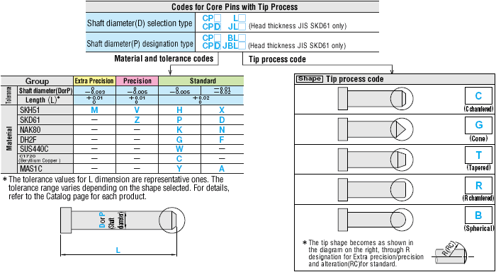 Following material will be discontinued when stocked materials are finished. PROVA400(Prehardened steel), PROVA400(Hardening steel), C1720(Beryllium copper) and MAS1C Material Characteristics of Straight Core Pins
